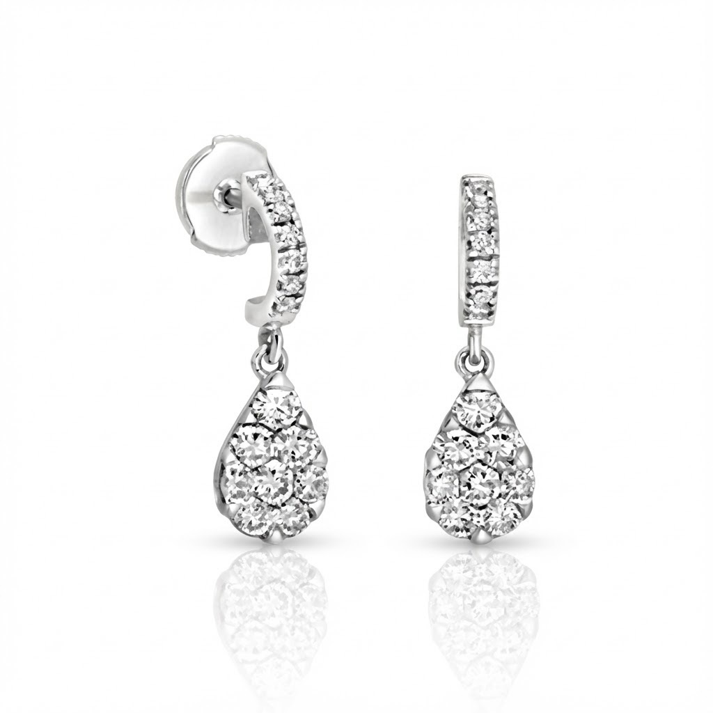 בכל עגיל משובצים יהלומים קטנים בצורת אשכול המדמה טיפה נוצצת, המשתלשלת בעדינות מחישוק משובץ.