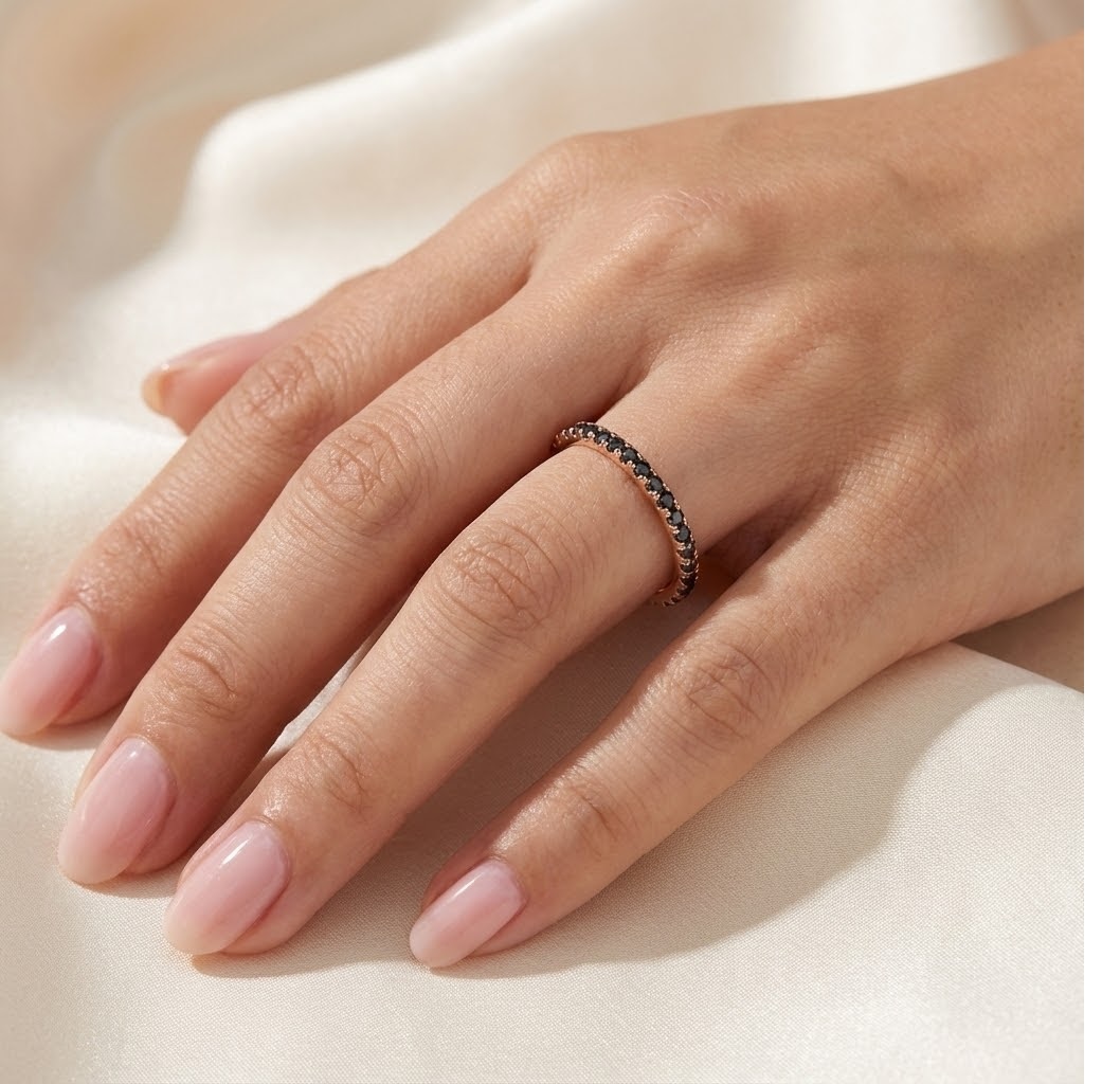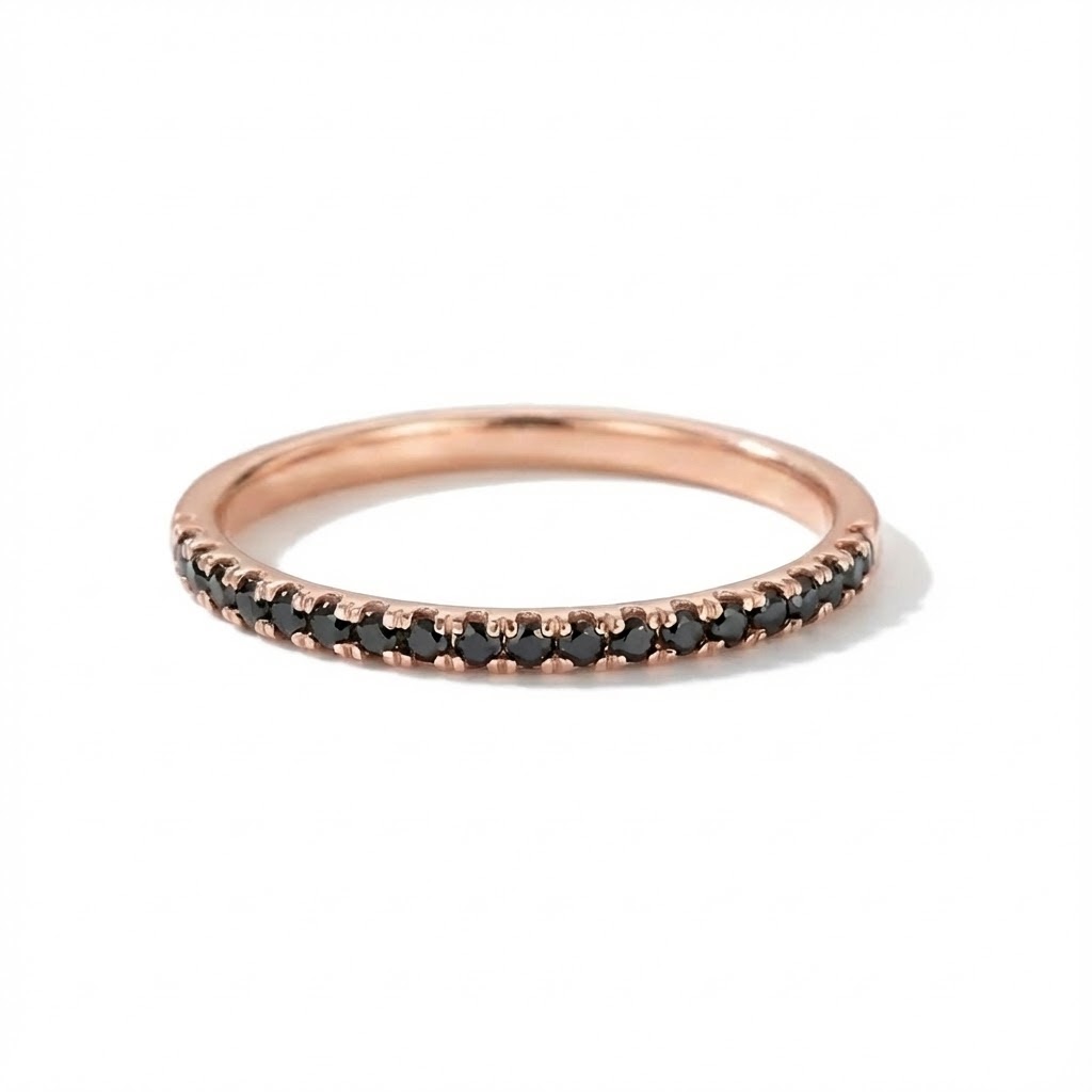 טבעת זהב אדום קלאסית בעיצוב מינימליסטי אך בולט, משובצת שורת אבני אוניקס שחורות בחיתוך עגול. הניגוד בין הזהב החמים לשחור העמוק יוצר מראה דרמטי, עוצמתי ומעודן בו-זמנית. מושלמת לשילוב עם טבעות נוספות או כטבעת סטייטמנט בפני עצמה.