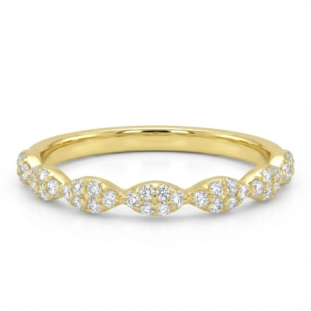 טבעת אלגנטית בעיצוב גלי ועדין, עשויה זהב לבן מוקפד. לאורך הלהקה משובצים אשכולות קטנים של יהלומים עגולים בפרופיל קל – היוצרים דינמיקה של אור ותנועה בכל מבט. שיבוץ הפריזמה הצמוד לאחוז המושלם של הלהקה מבליט את הניצוץ הטבעי של היהלומים, ומעניק טבעת שמשלבת קלאסיות ועדכניות בסגנון אחד.