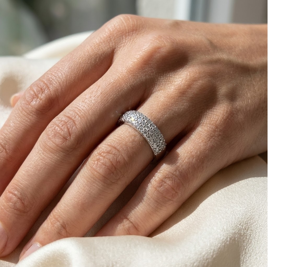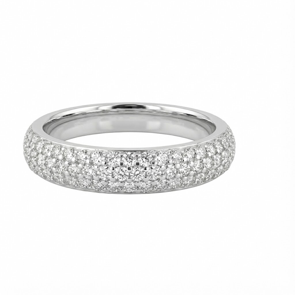 השיבוץ הצפוף בשילוב הגימור הנקי של הזהב הלבן יוצר טבעת שהיא גם נוחה, גם נצחית וגם יוקרתית.