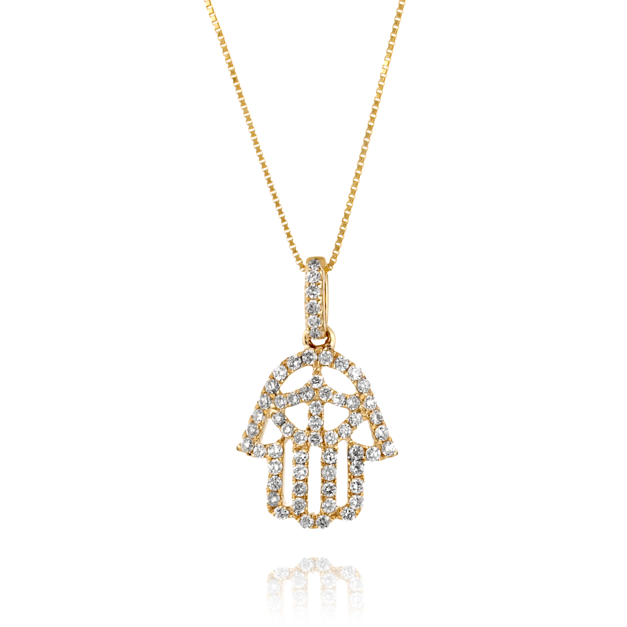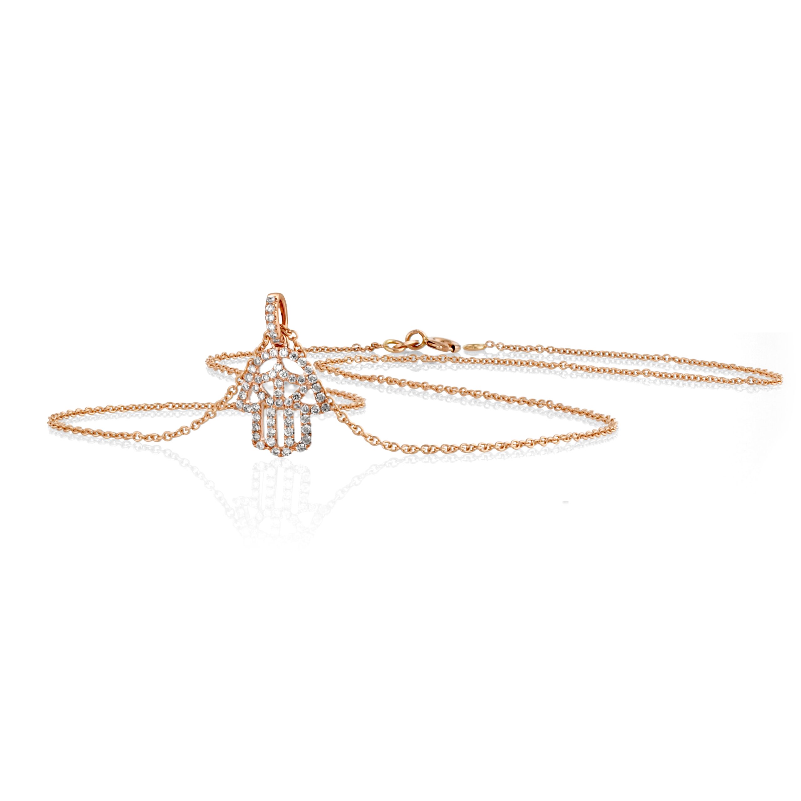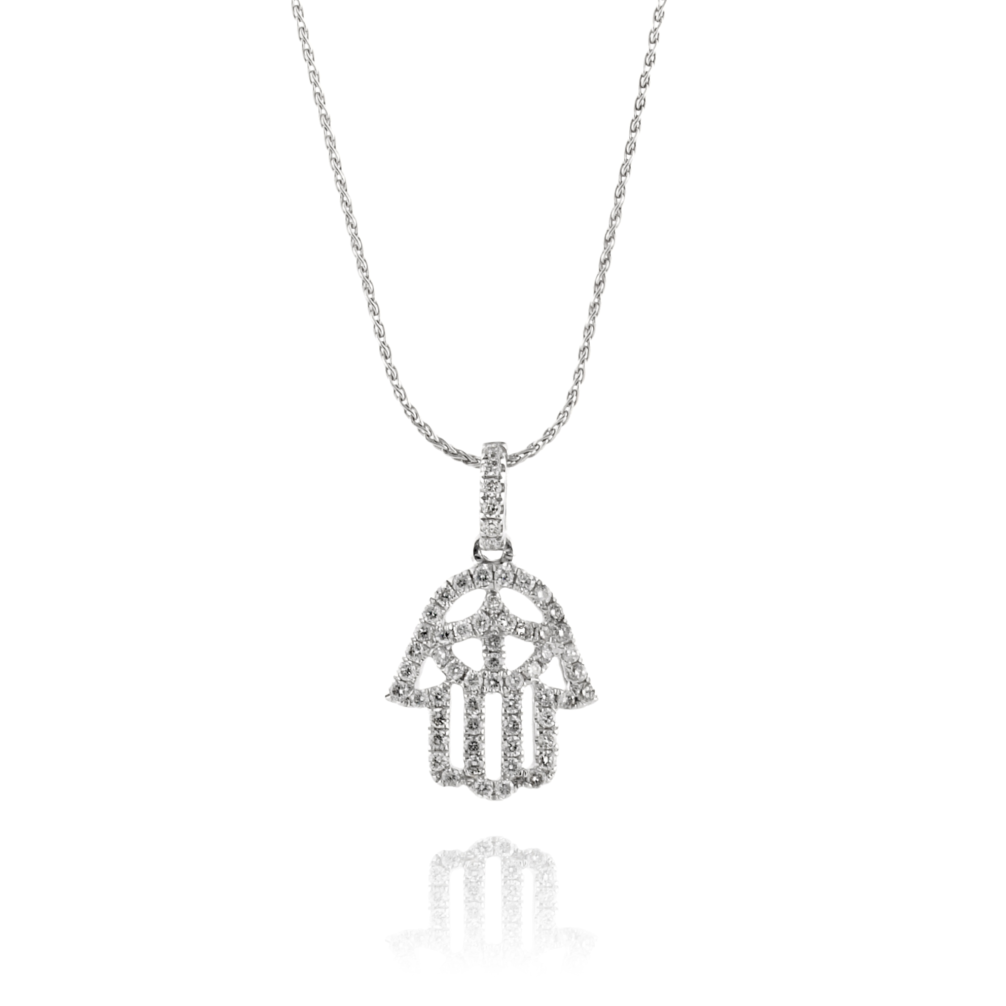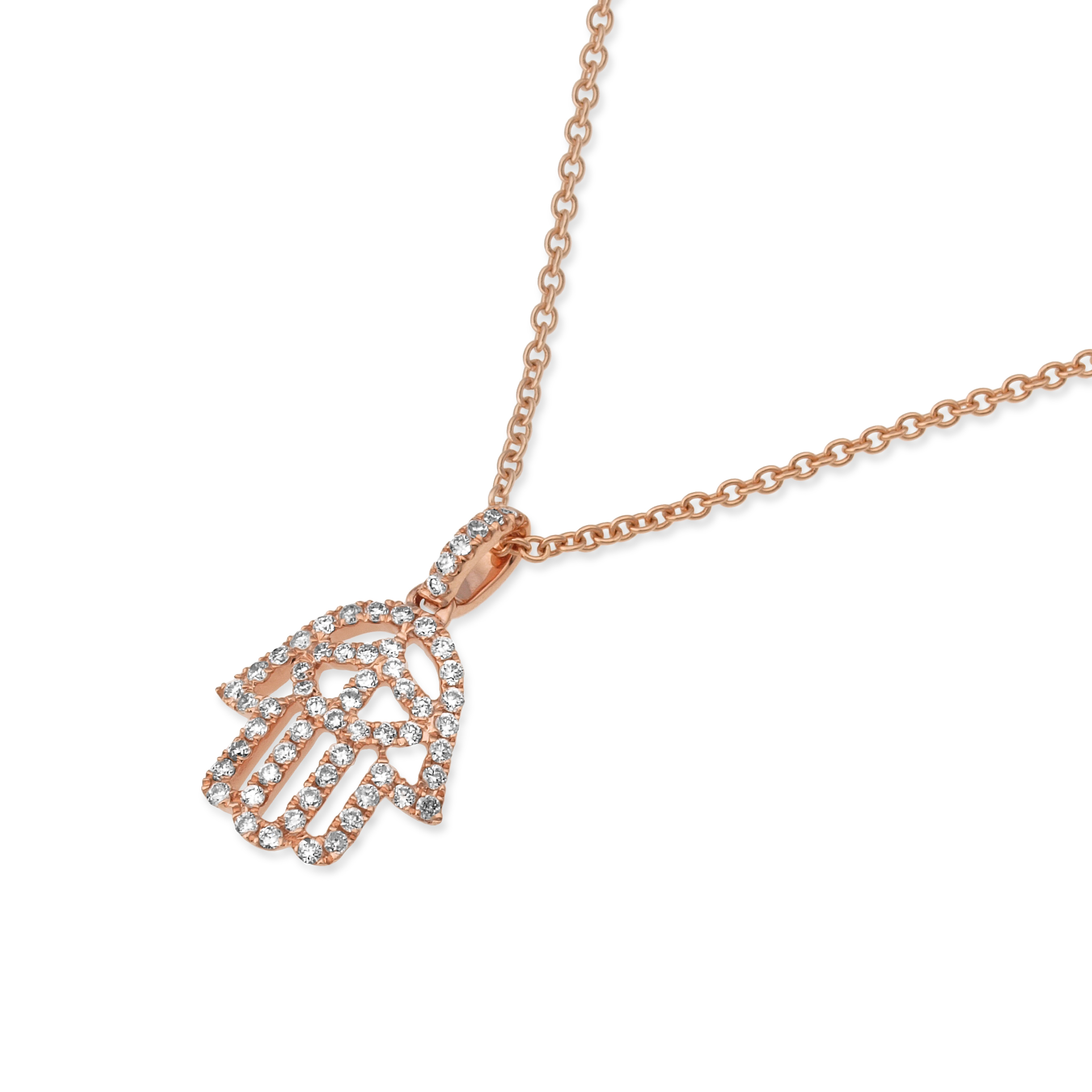 תליון אורימה בצורת חמסה משובץ בשורה מדויקת של יהלומי פאבה נוצצים כל אבן מלטפת את המתכת החמה ויוצרת שובל של אור בכל תנועה