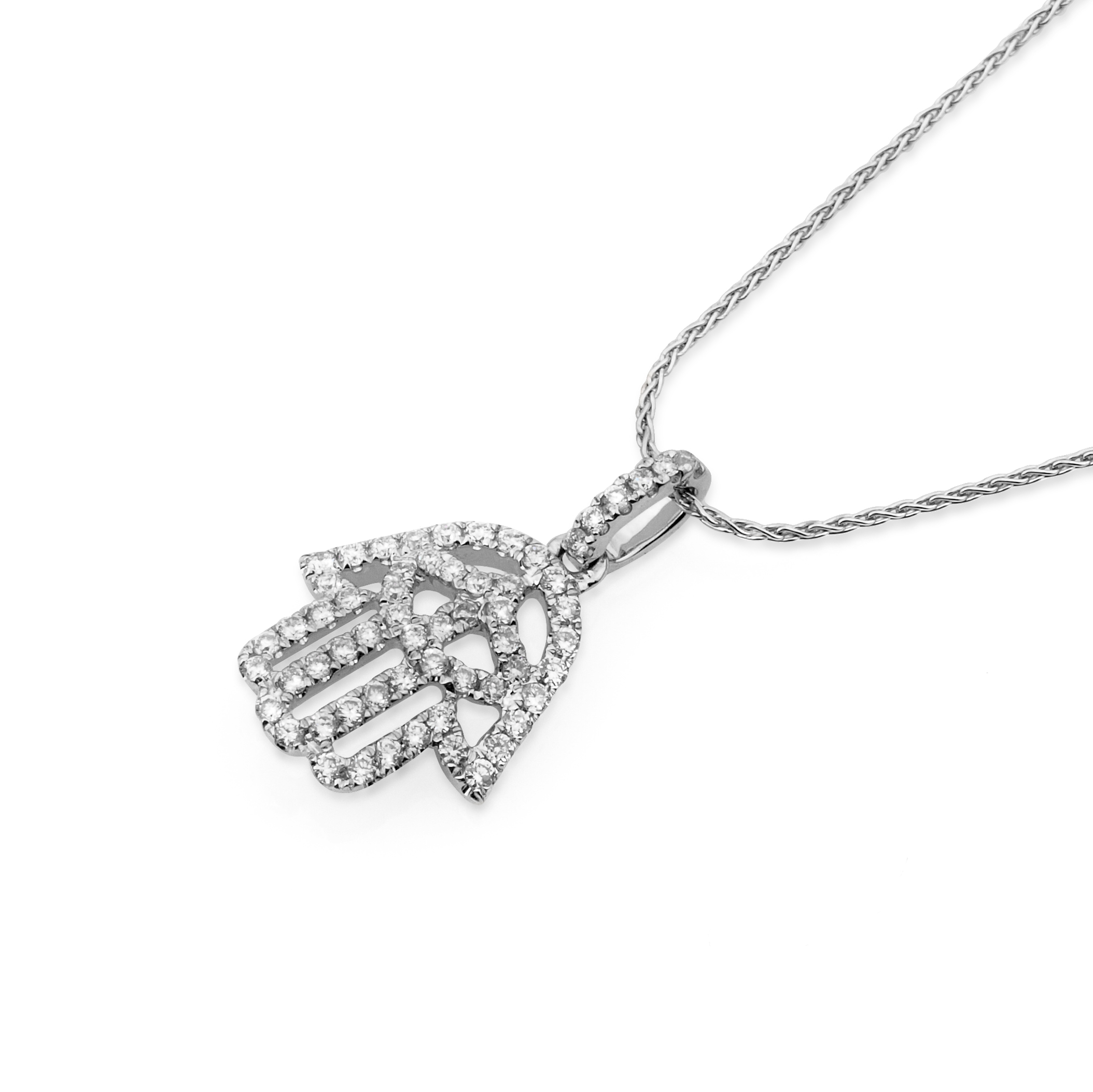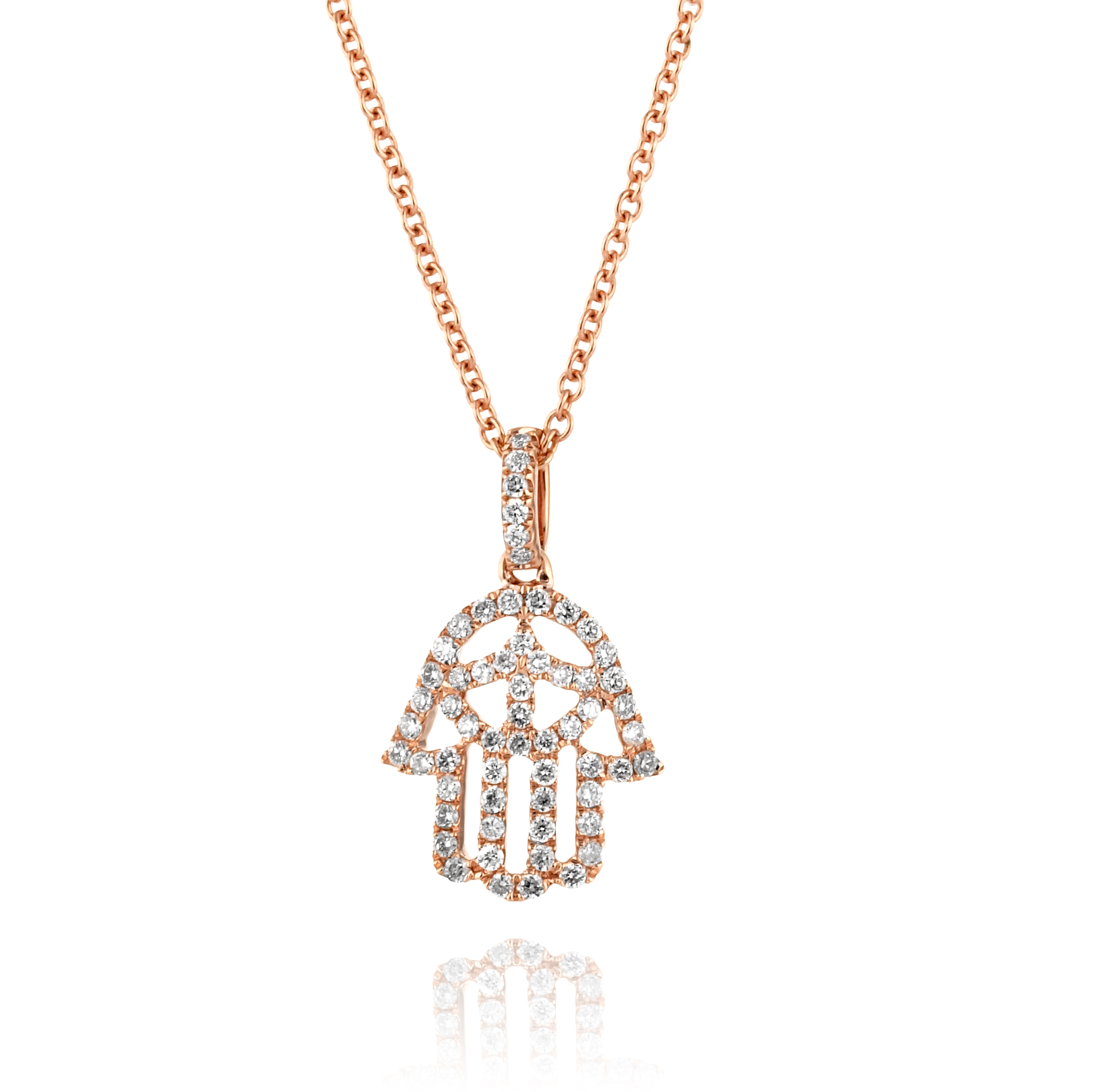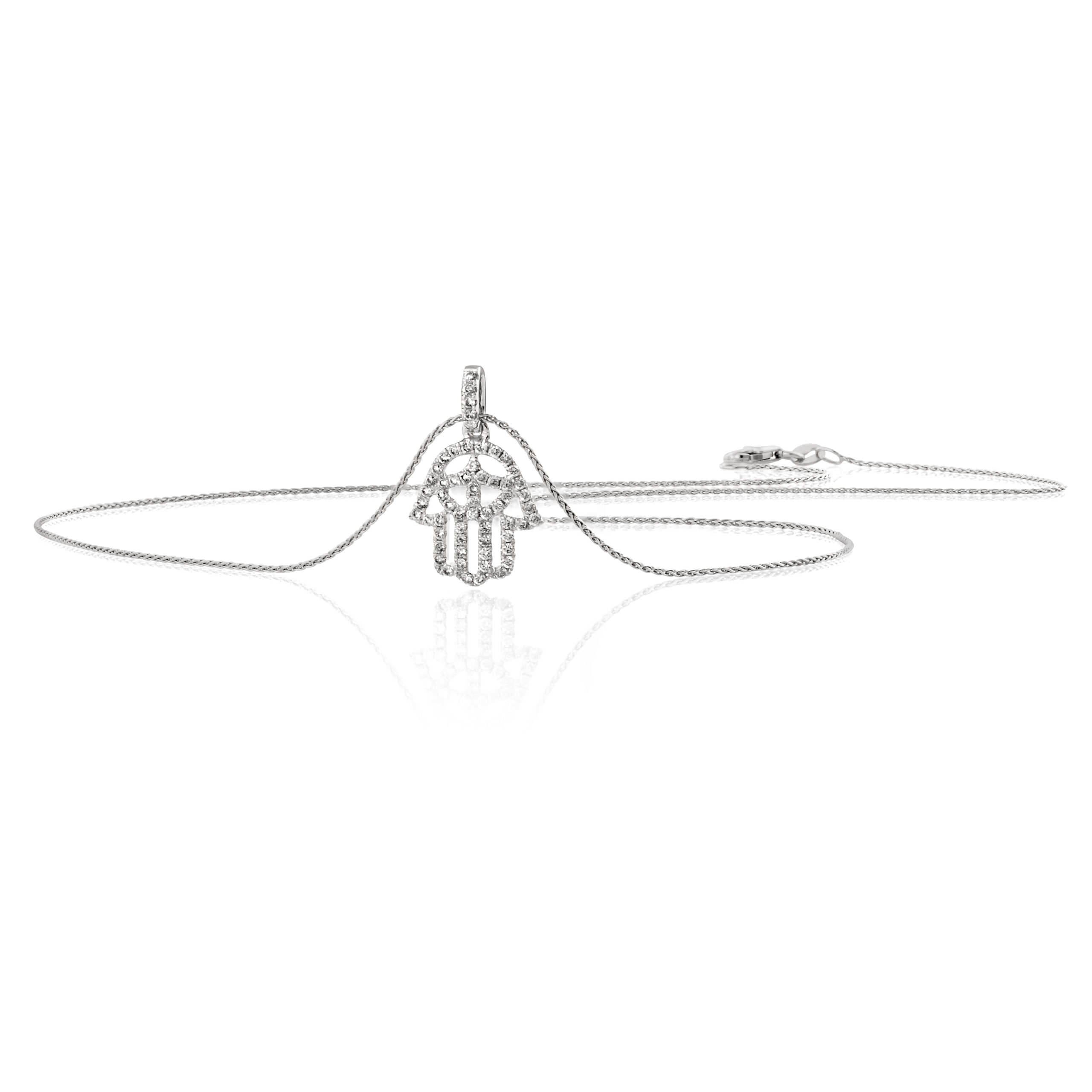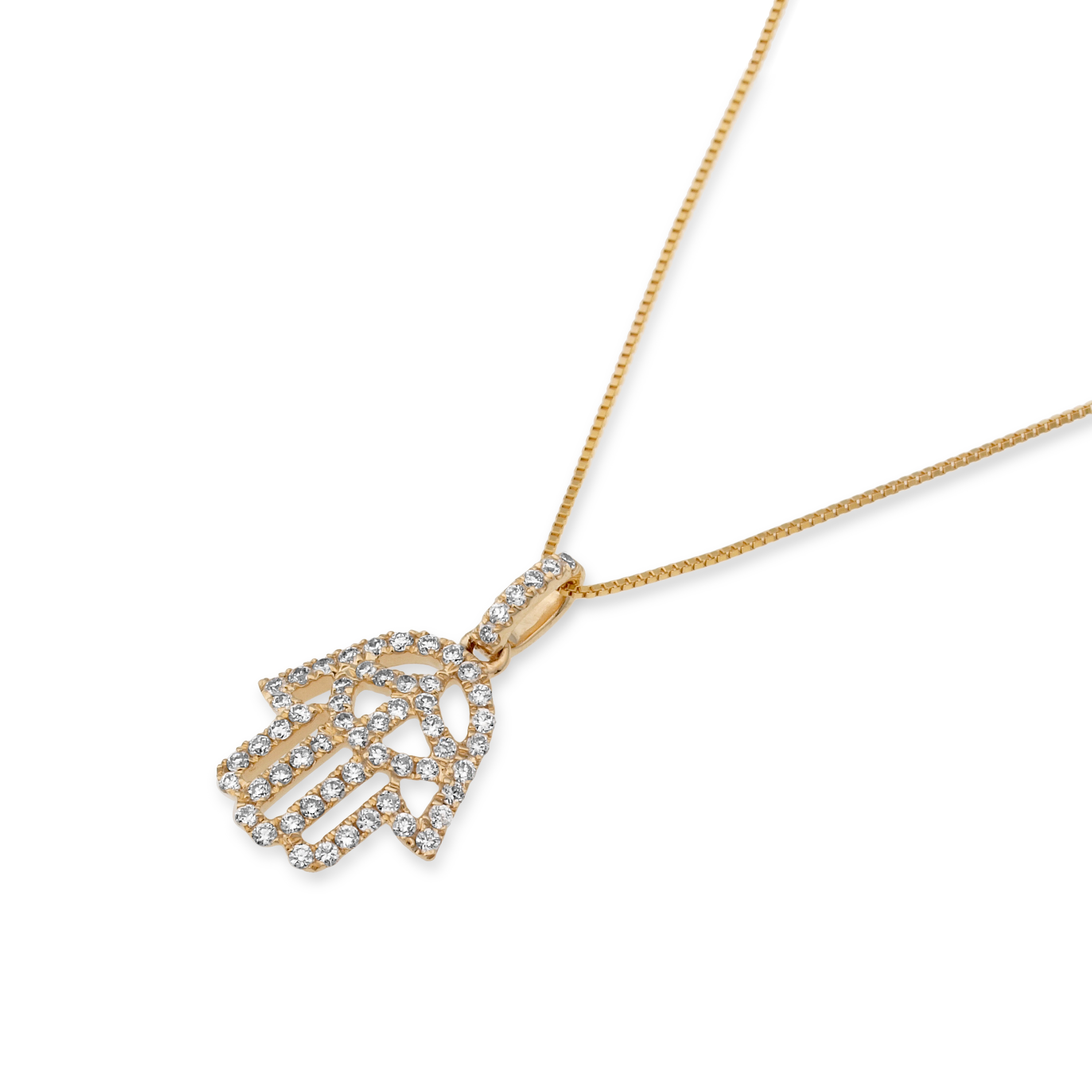תליון אורימה בצורת חמסה משובץ בשורה מדויקת של יהלומי פאבה נוצצים כל אבן מלטפת את המתכת החמה ויוצרת שובל של אור בכל תנועה