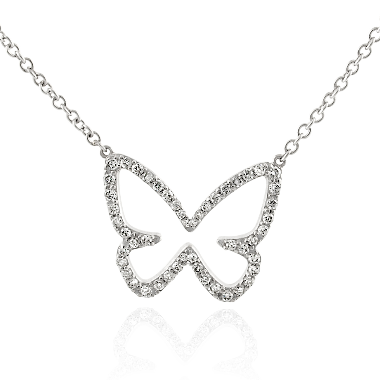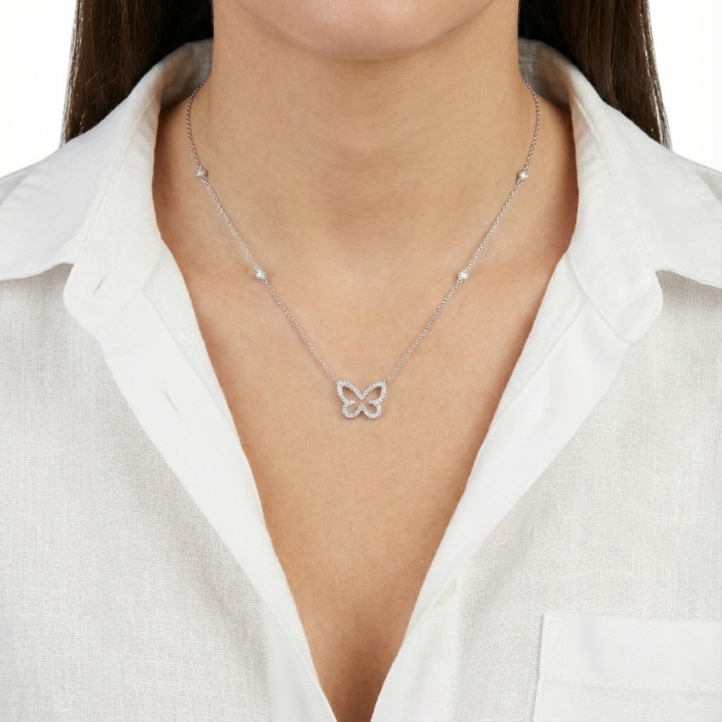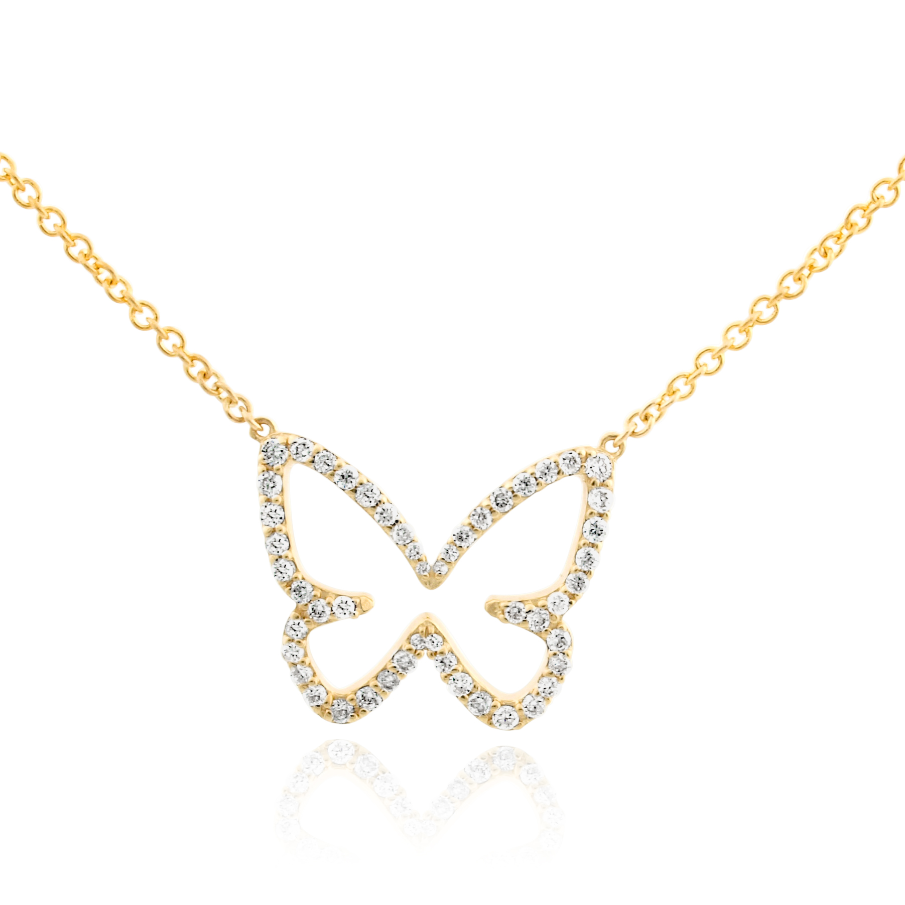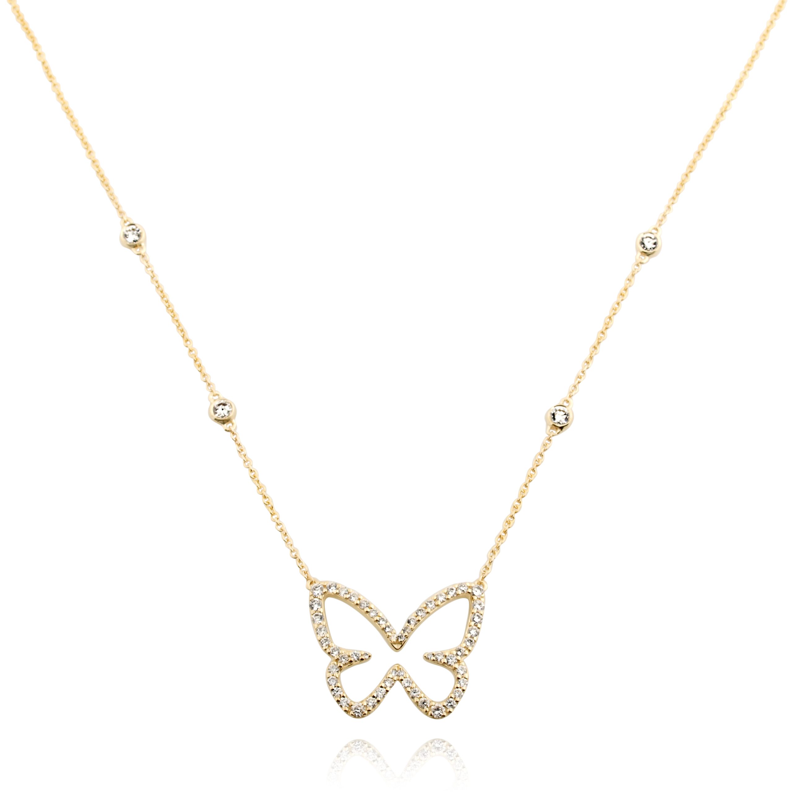 פרפרית – שרשרת עדינה עם תליון פרפר בגוף פתוח, המשובץ לאורך קווי המתאר ביהלומים קטנים. הכנפיים המעוגלות יוצרות מראה נשי וקליל, והשרשרת עצמה משובצת בנקודות יהלומים לאורך משכה לקבלת ברק עדין סביב הצוואר.