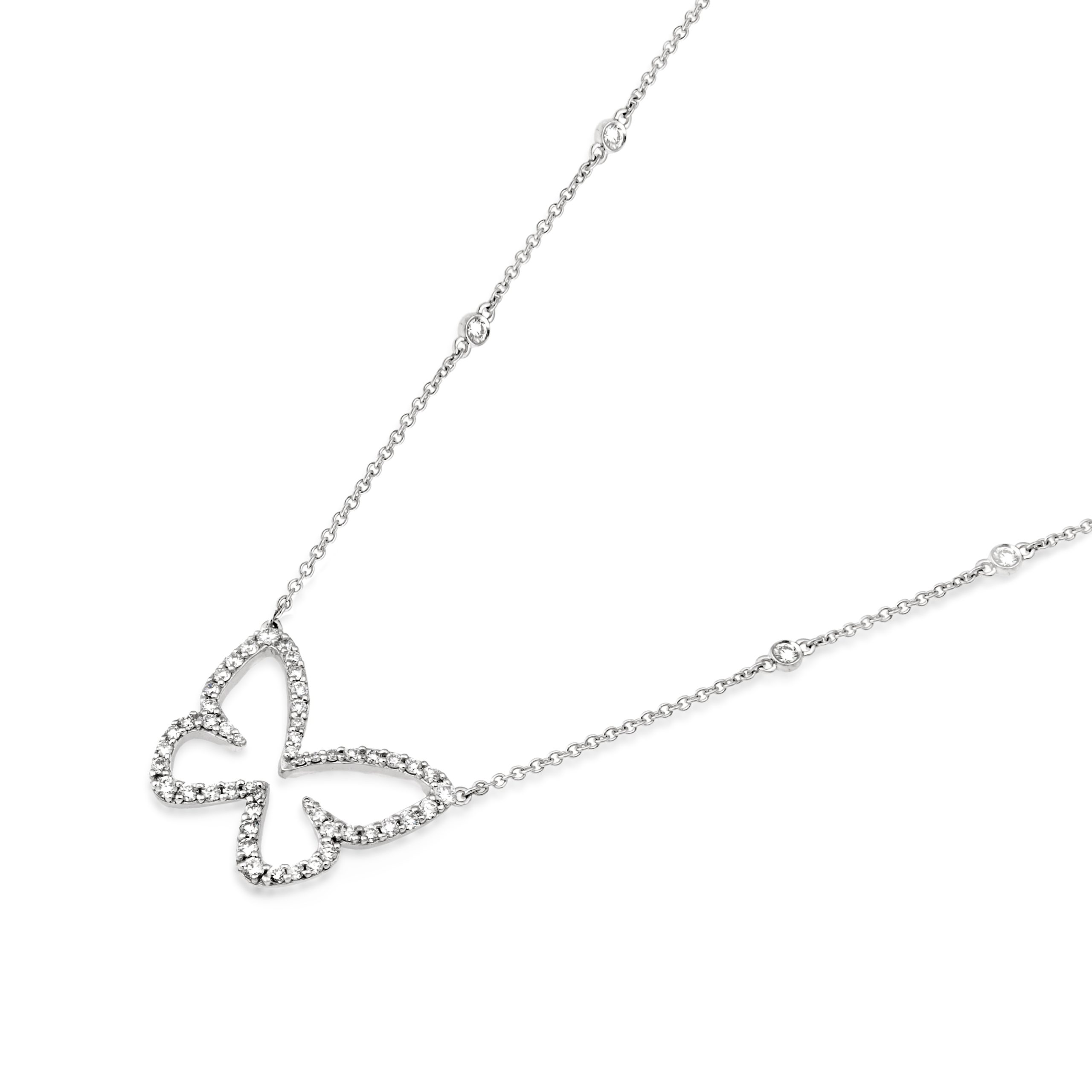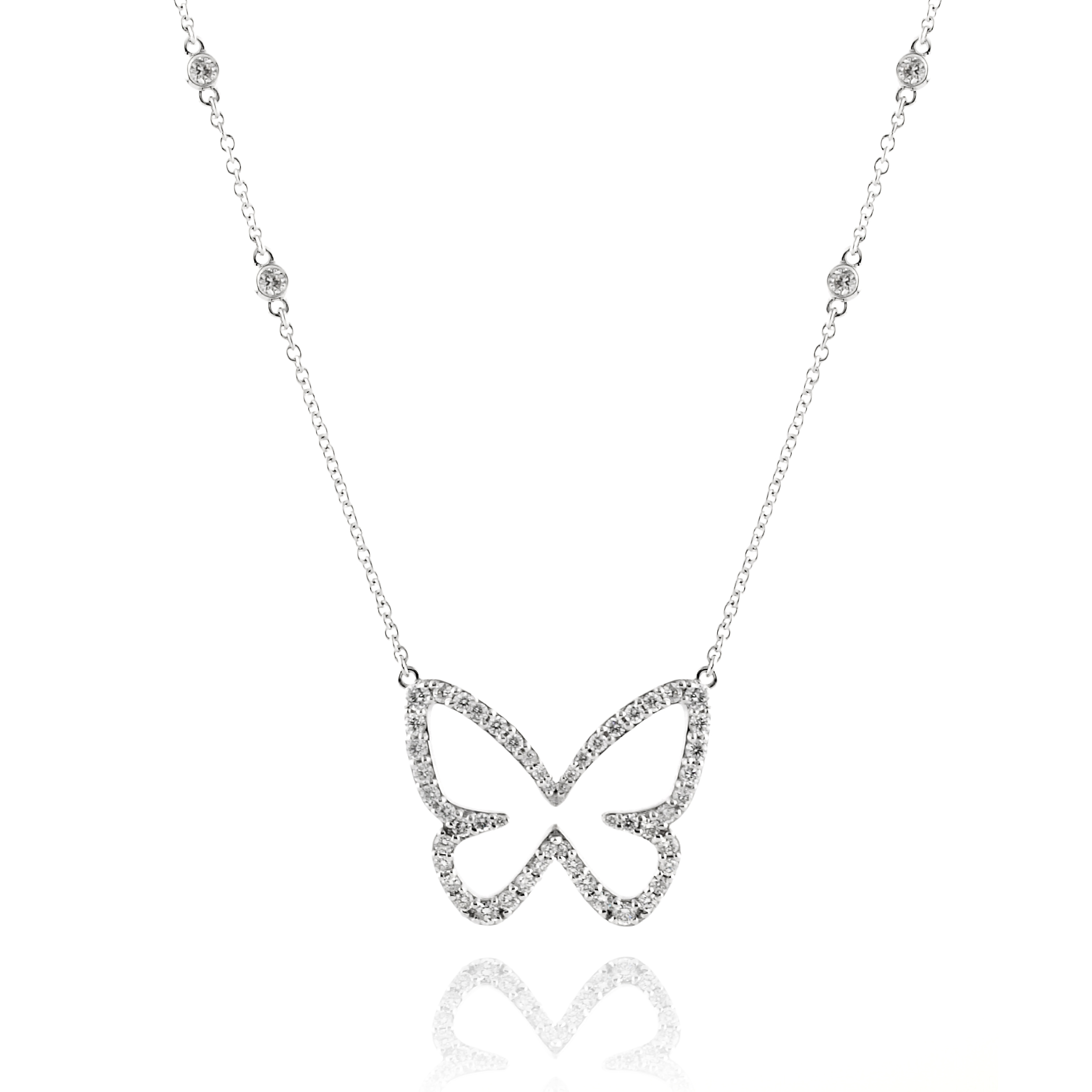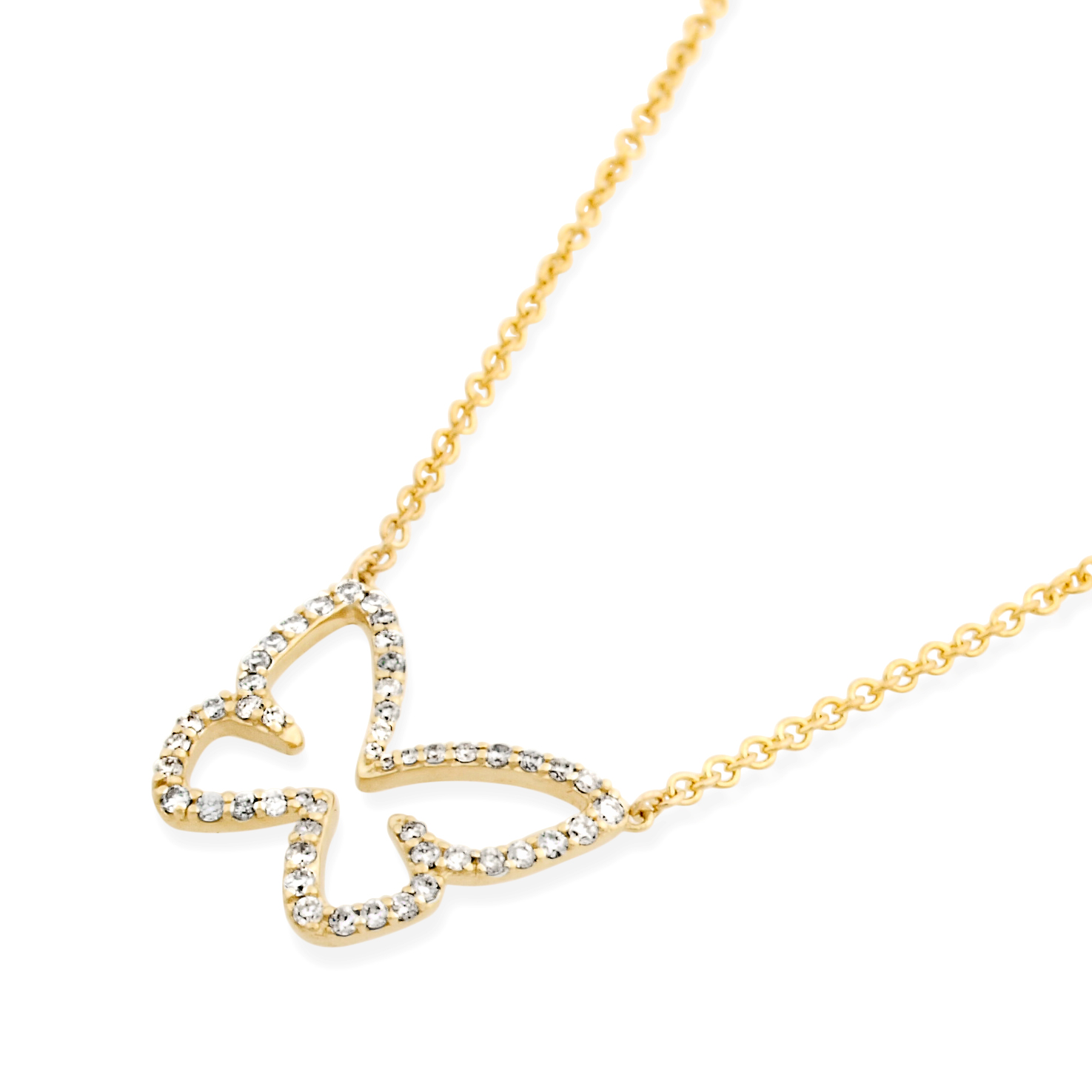 פרפרית – שרשרת עדינה עם תליון פרפר בגוף פתוח, המשובץ לאורך קווי המתאר ביהלומים קטנים. הכנפיים המעוגלות יוצרות מראה נשי וקליל, והשרשרת עצמה משובצת בנקודות יהלומים לאורך משכה לקבלת ברק עדין סביב הצוואר.