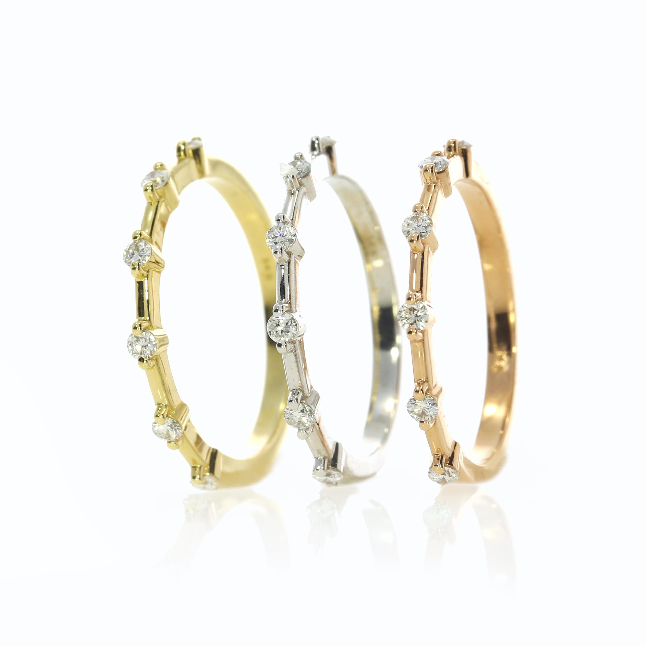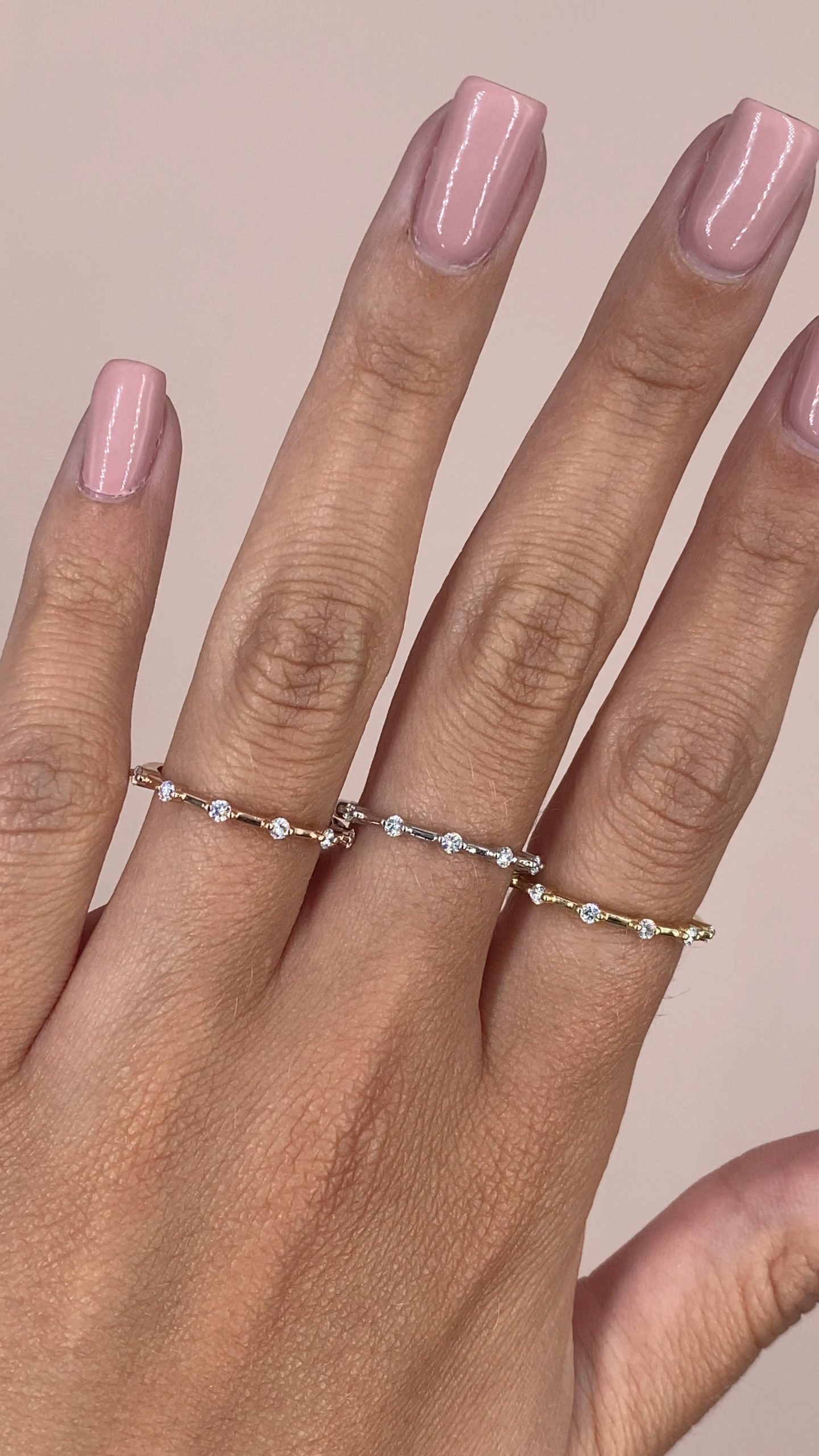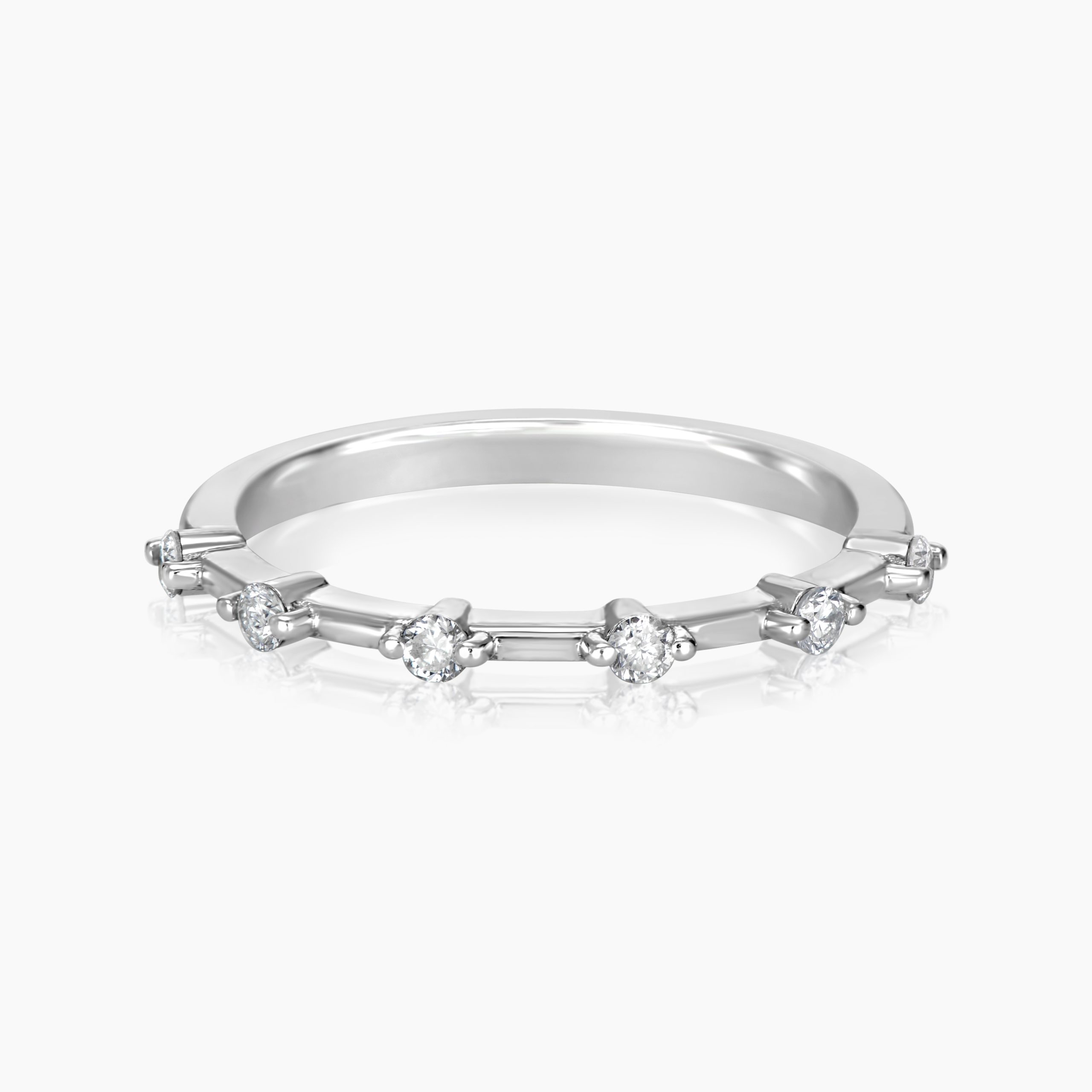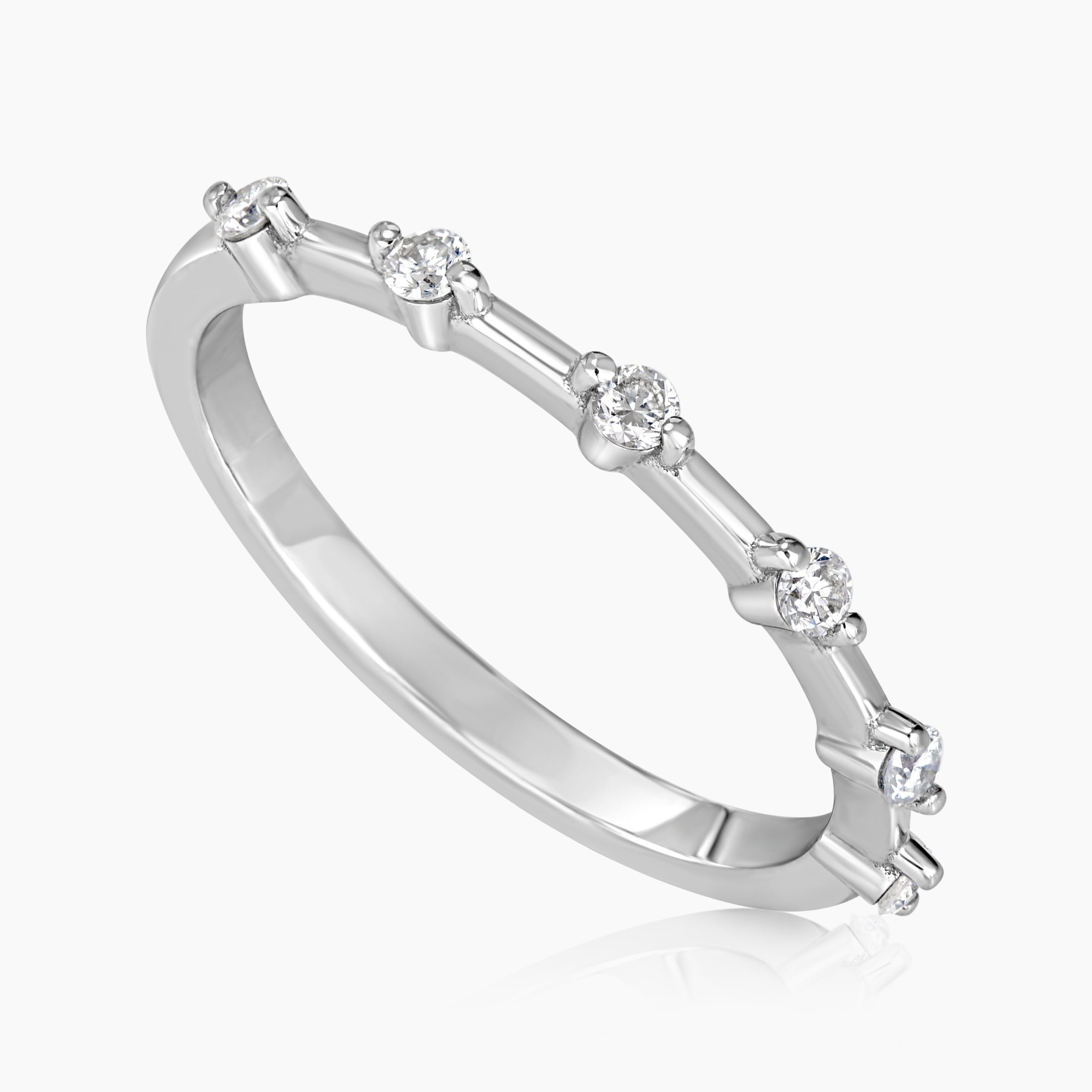 פונטי,טבעת עדינה עשויה זהב לבן מוקפד, על זרוע הטבעת פזורים יהלומים עגולים קטנים בשיבוץ four‑prong, בין קטעי מתכת מלוטשים היוצרים מרווחים קלים שבין כל אבן. עיצוב ה“נקודות” האלה יוצר תחושת אור ותנועה שתופסת את העין בכל סיבוב של האצבע, בעוד הזרוע הדקה מבטיחה נוחות מקסימלית ללבישה יום־יומית.