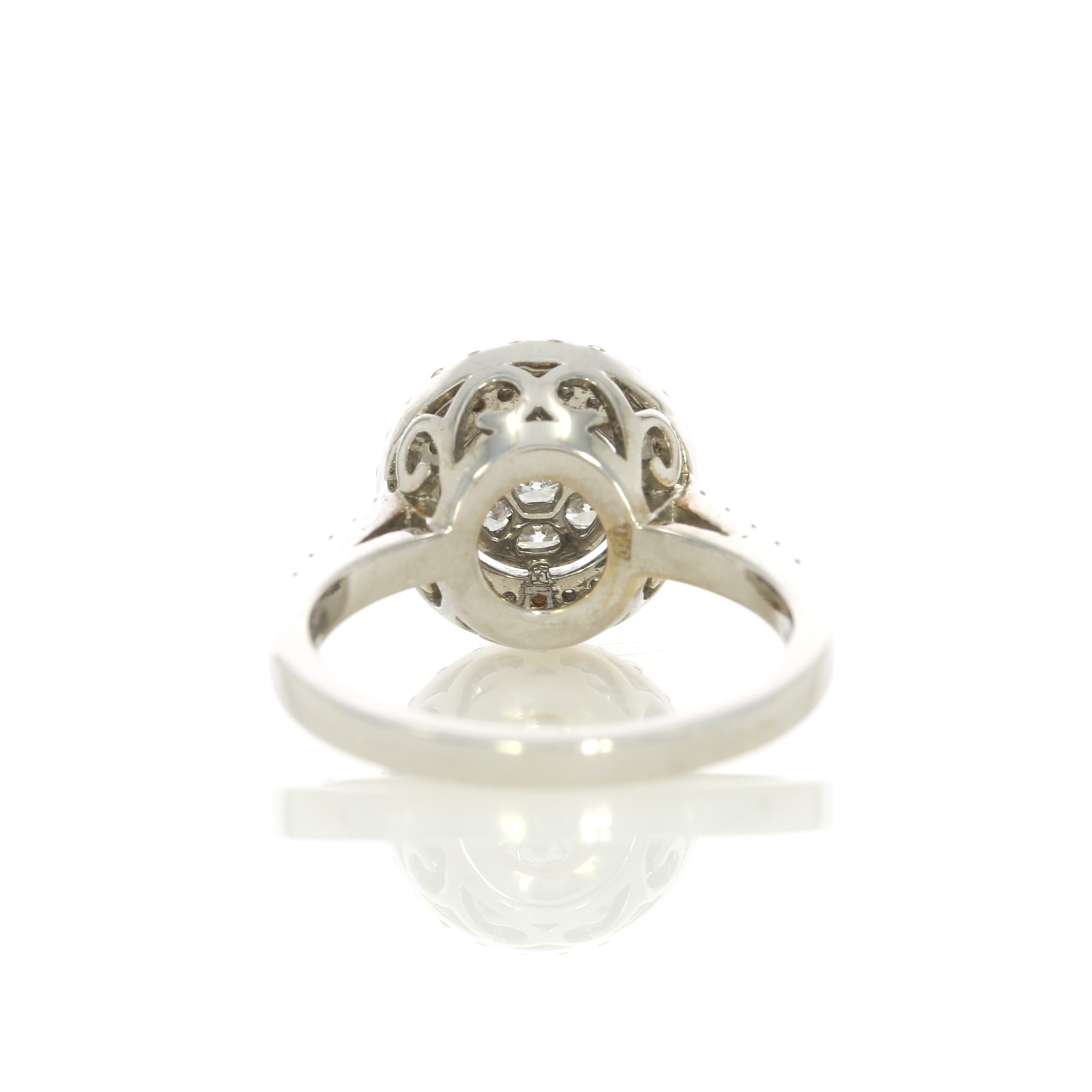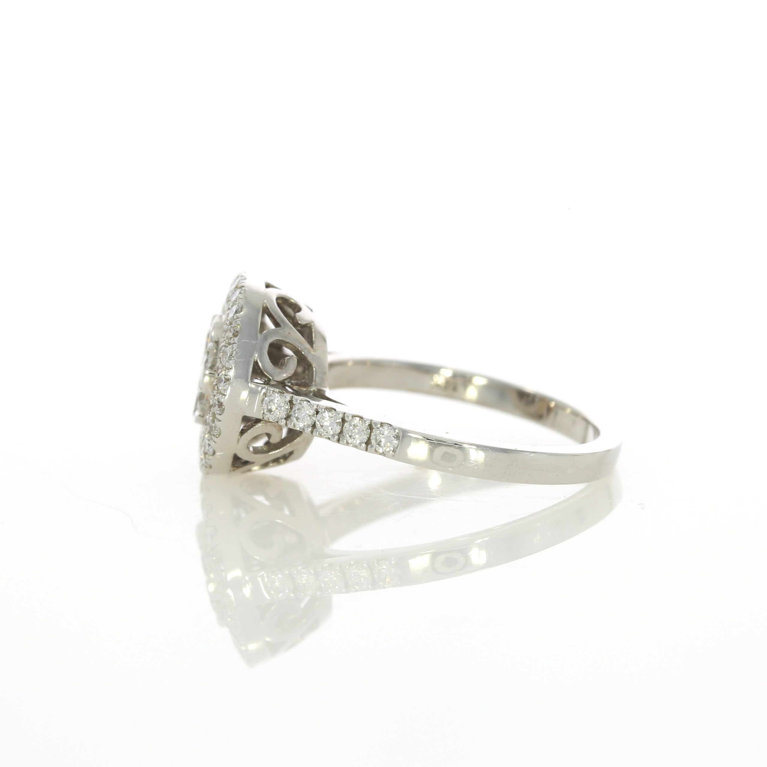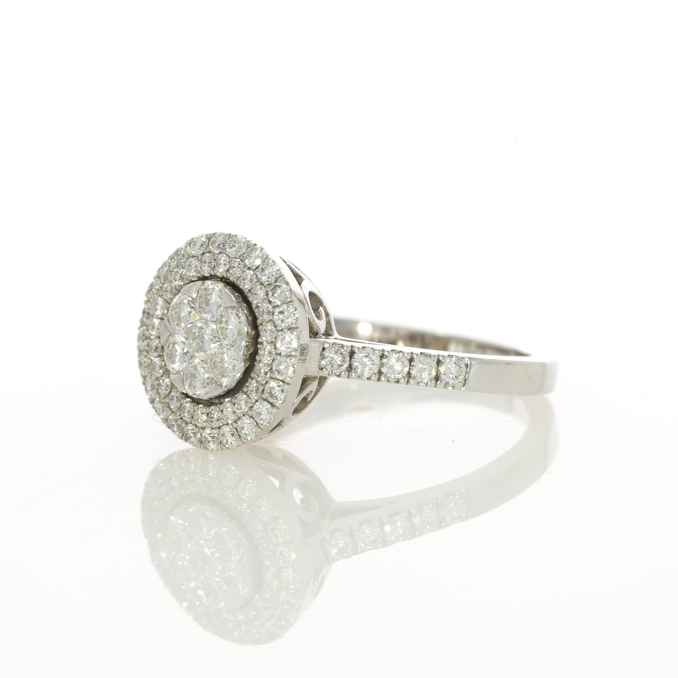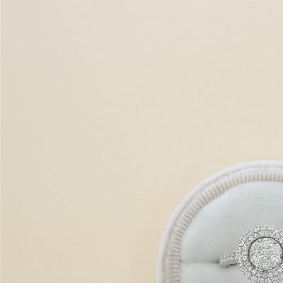 העיצוב כולל שתי שורות Halo של יהלומים שמקיפות את המרכז ומעצימות את הברק, עם זרועות משובצות יהלומים להשלמת מראה יוקרתי מכל זווית.