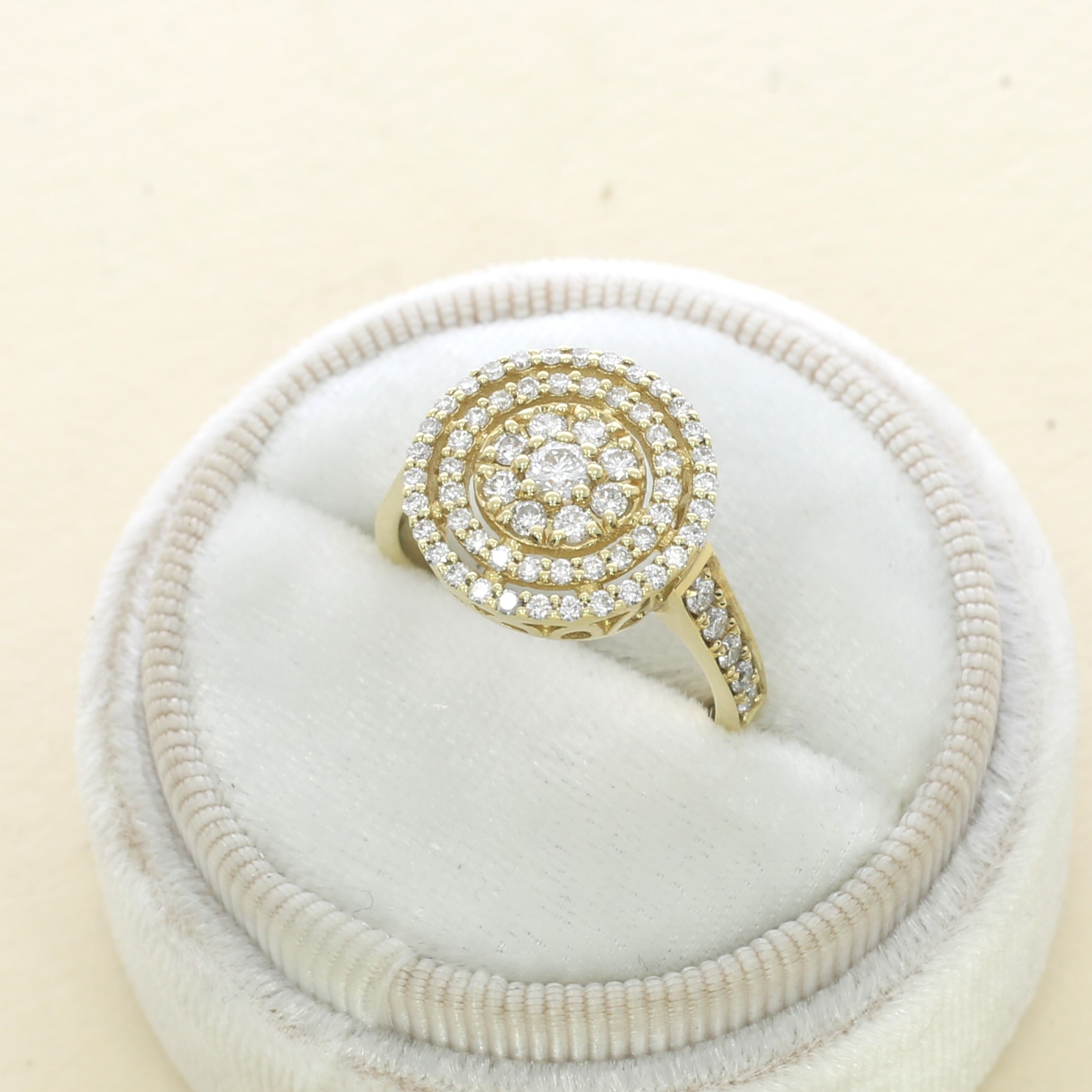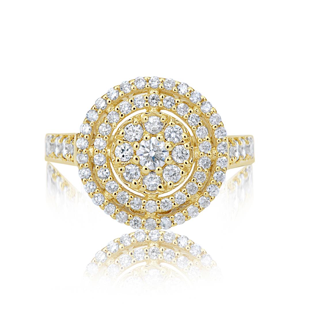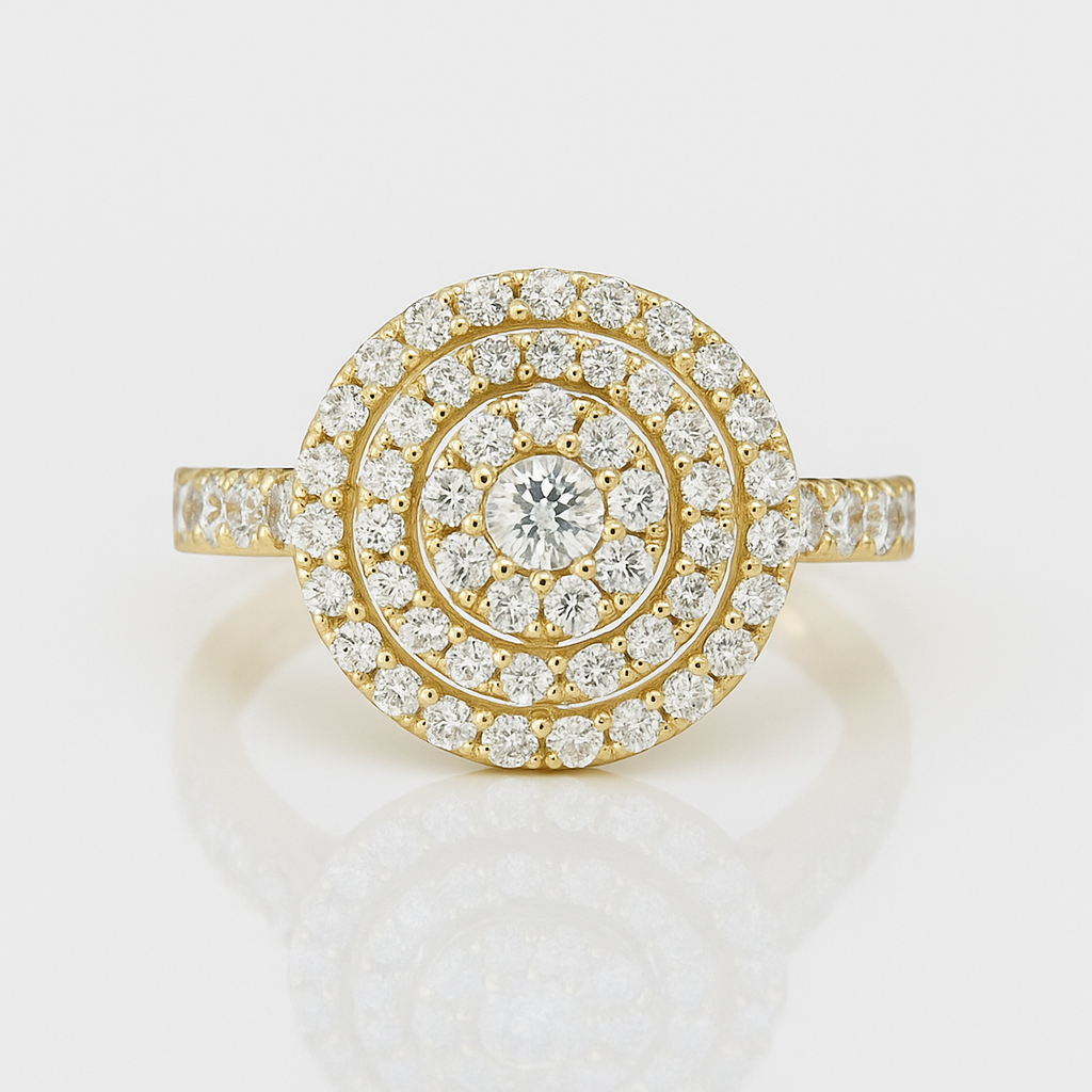 סולן היא טבעת שמשדרת עוצמה, זוהר ועיצוב מוקפד עד הפרט האחרון. במרכזה שיבוץ עגול המדמה פרח נוצץ, מוקף בשלוש שכבות יהלומים עגולים שמעניקות אפקט מהפנט של ברק בתנועה.