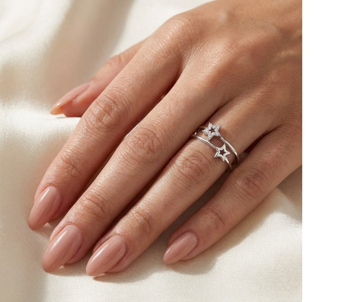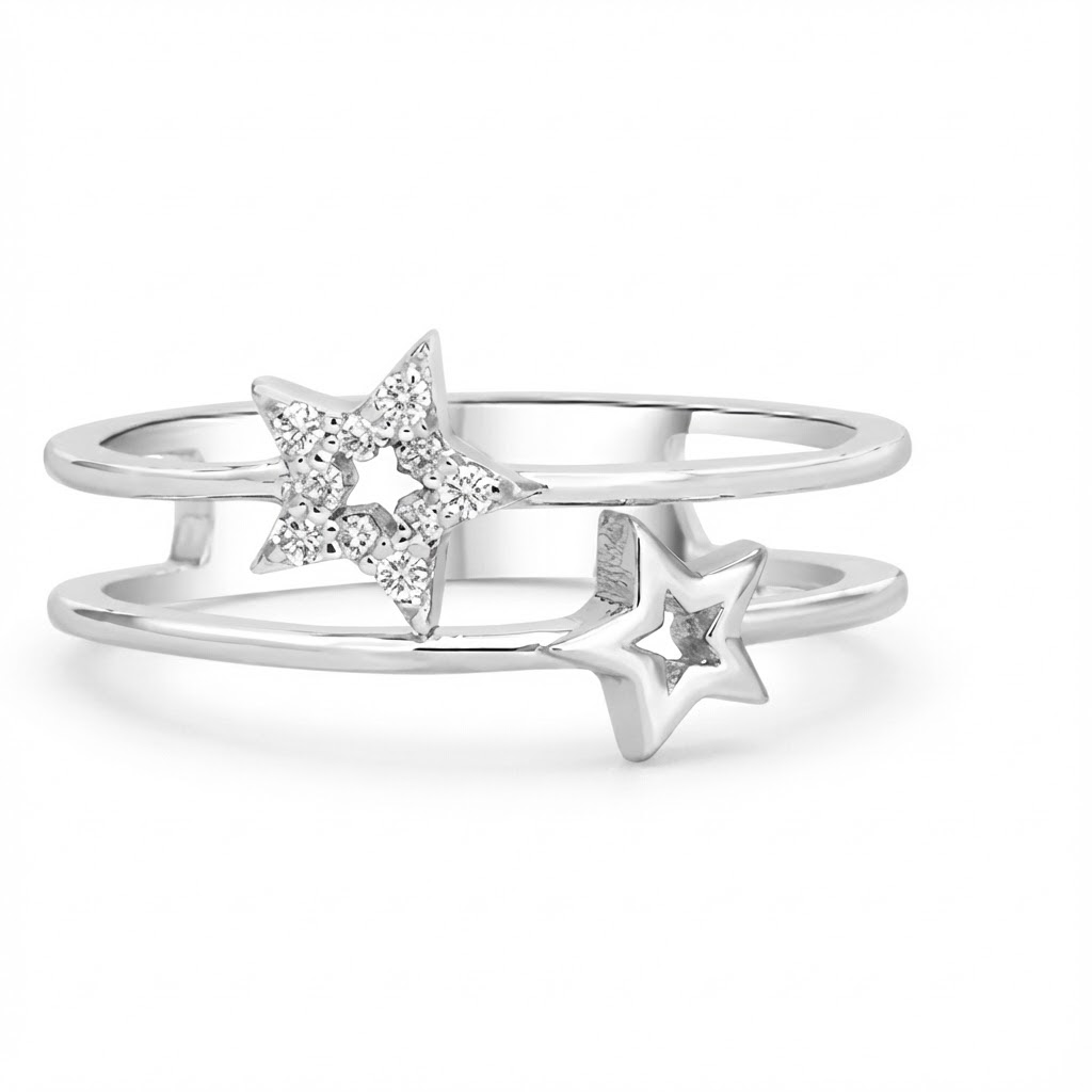 טבעת עדינה ומלאת אופי בעיצוב פתוח, שמשלבת שני כוכבים: האחד מעוטר ביהלומים מנצנצים והשני בגימור חלק ונקי. השילוב בין זוהר מודרני לנגיעות של ילדותיות קסומה הופך את הטבעת הזו לבחירה מושלמת למראה ייחודי ויומיומי כאחד.