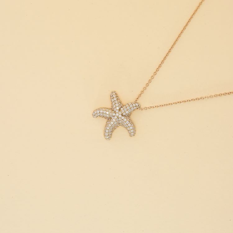 סטליה הוא תליון עדין עם נוכחות בוהקת, המעוצב בצורת כוכב ים ומתאים לכל מי שמרגישה חיבור לים, לחופש ולסטייל מיוחד. כל זרוע של כוכב הים משובצת ביהלומים עגולים נוצצים, המונחים בזהירות בזהב רוז גולד ומעניקים לכל תנועה אפקט של ברק ייחודי ועדין.