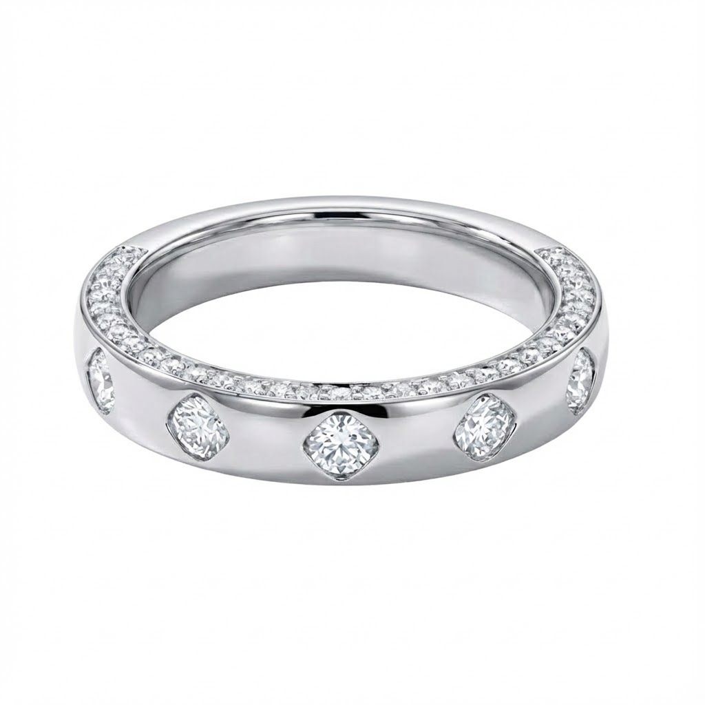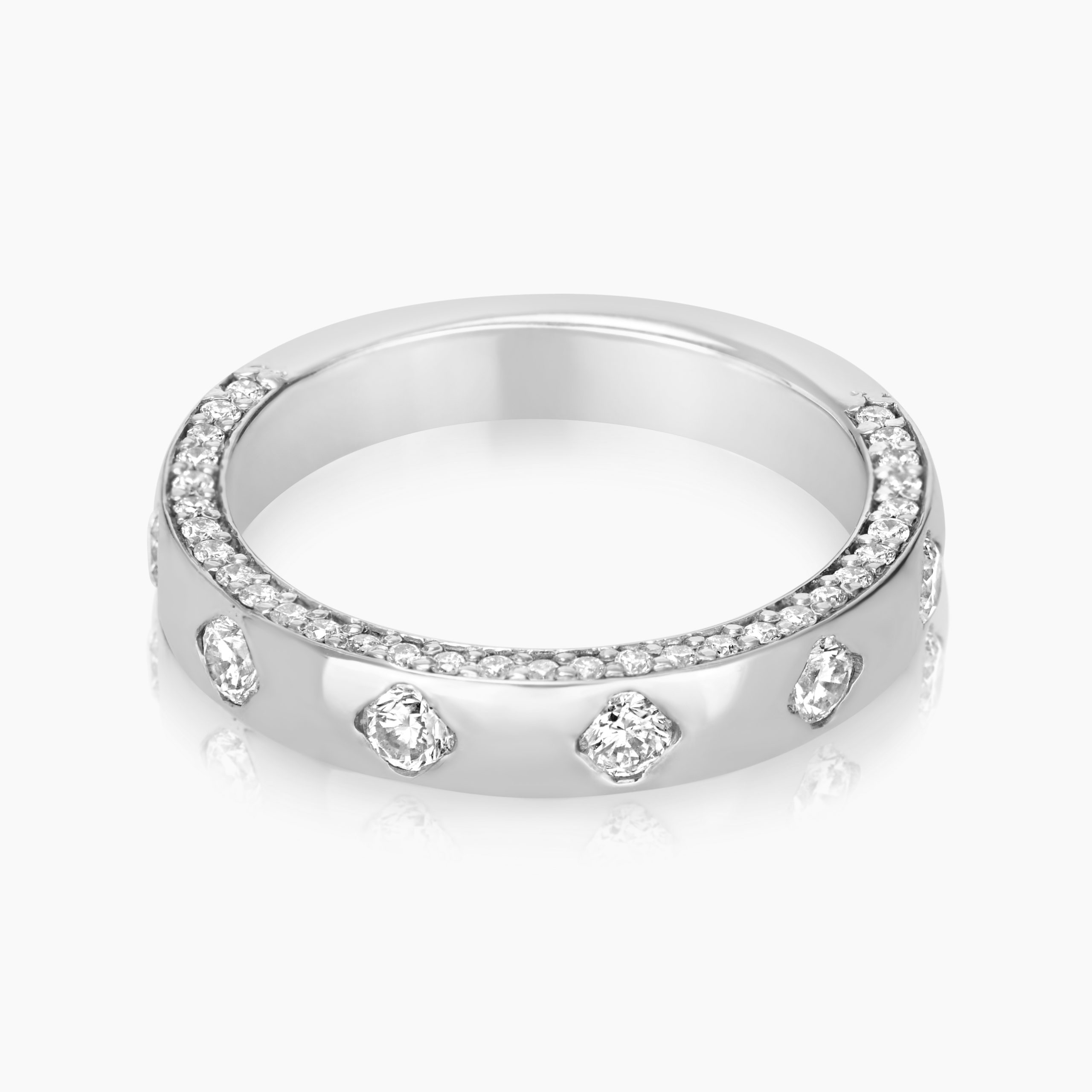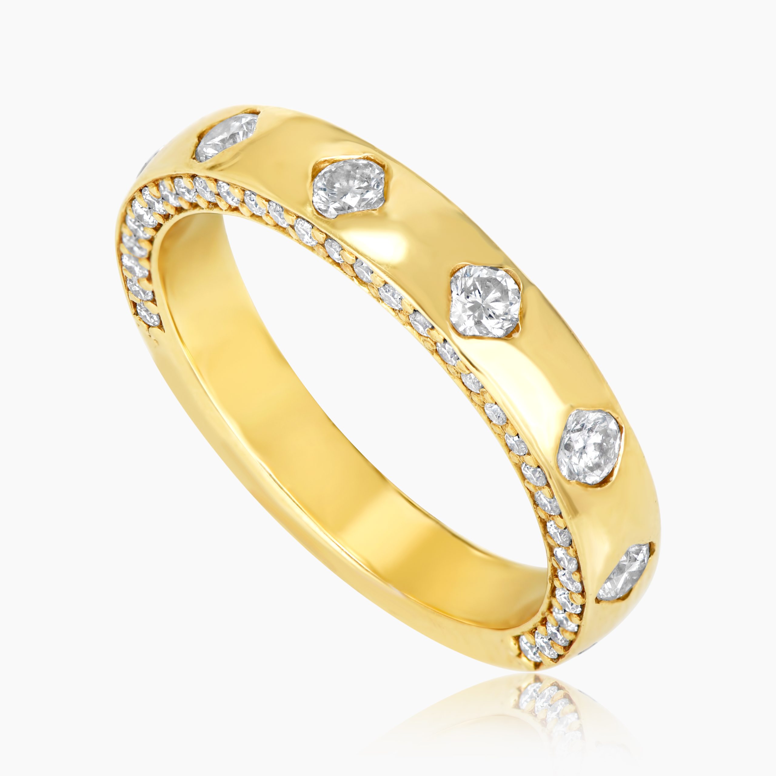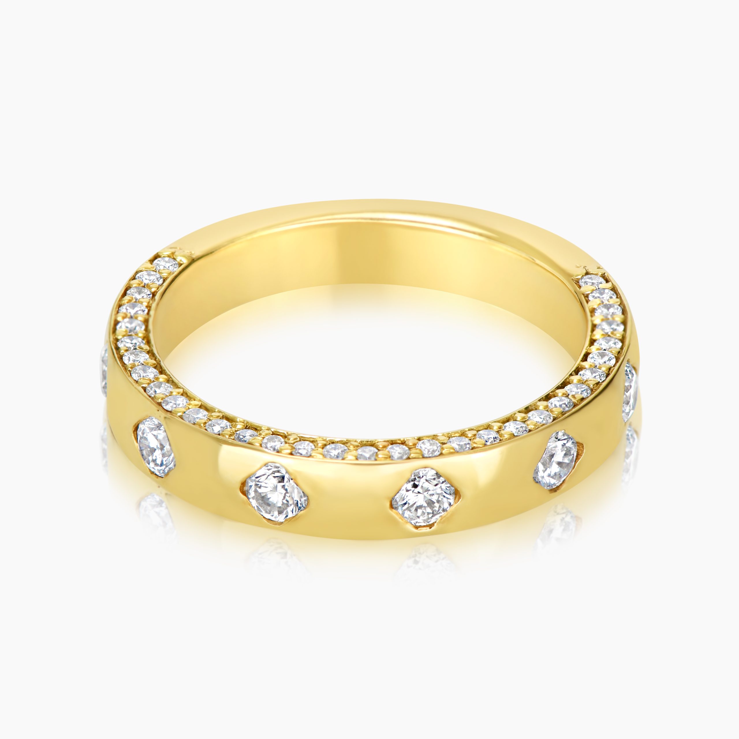 ונטו,טבעת ייחודית בעיצוב עכשווי, עשויה זהב צהוב מוקפד, עם זרוע הטבעת המלוטשת המעוטרת בשיבוץ בזל שטוח של יהלומים עגולים גדולים המפוזרים בצורה סימטרית. במקביל, לאורך חלקה הפנימי של הזרוע חורצת תעלה עדינה משובצת בשורה של יהלומים קטנים בשיבוץ מלגריין, היוצרת קו ברק מתמשך ומרקם וינטאג’ מוקפד. השילוב בין הבזל הבולט לתעלת האבן הפנימית מייצר משחק אור עשיר ותלת־ממדי על האצבע, בעוד המראה הכולל נשמר קליל ואלגנטי.