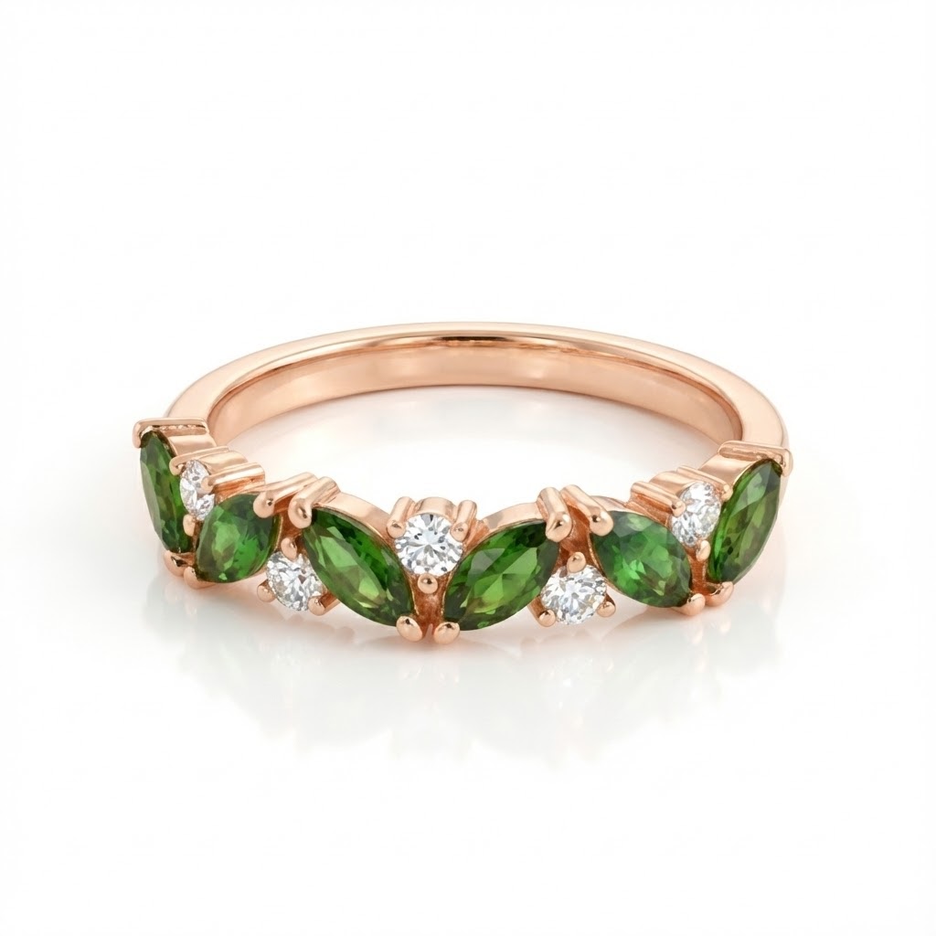 ורדטניה טבעת ייחודית ואלגנטית עם נוכחות מרשימה – משובצת באבני כרום טורמלין ירוקות בחיתוך מרקיזה, לסירוגין עם יהלומים עגולים נוצצים שמוסיפים ברק וזוהר. השילוב בין הירוק העמוק של אבני החן לנצנוץ היהלומים יוצר מראה אלגנטי אך בלתי שגרתי – מושלם למי שמחפשת טבעת עם סטייל יוצא דופן.